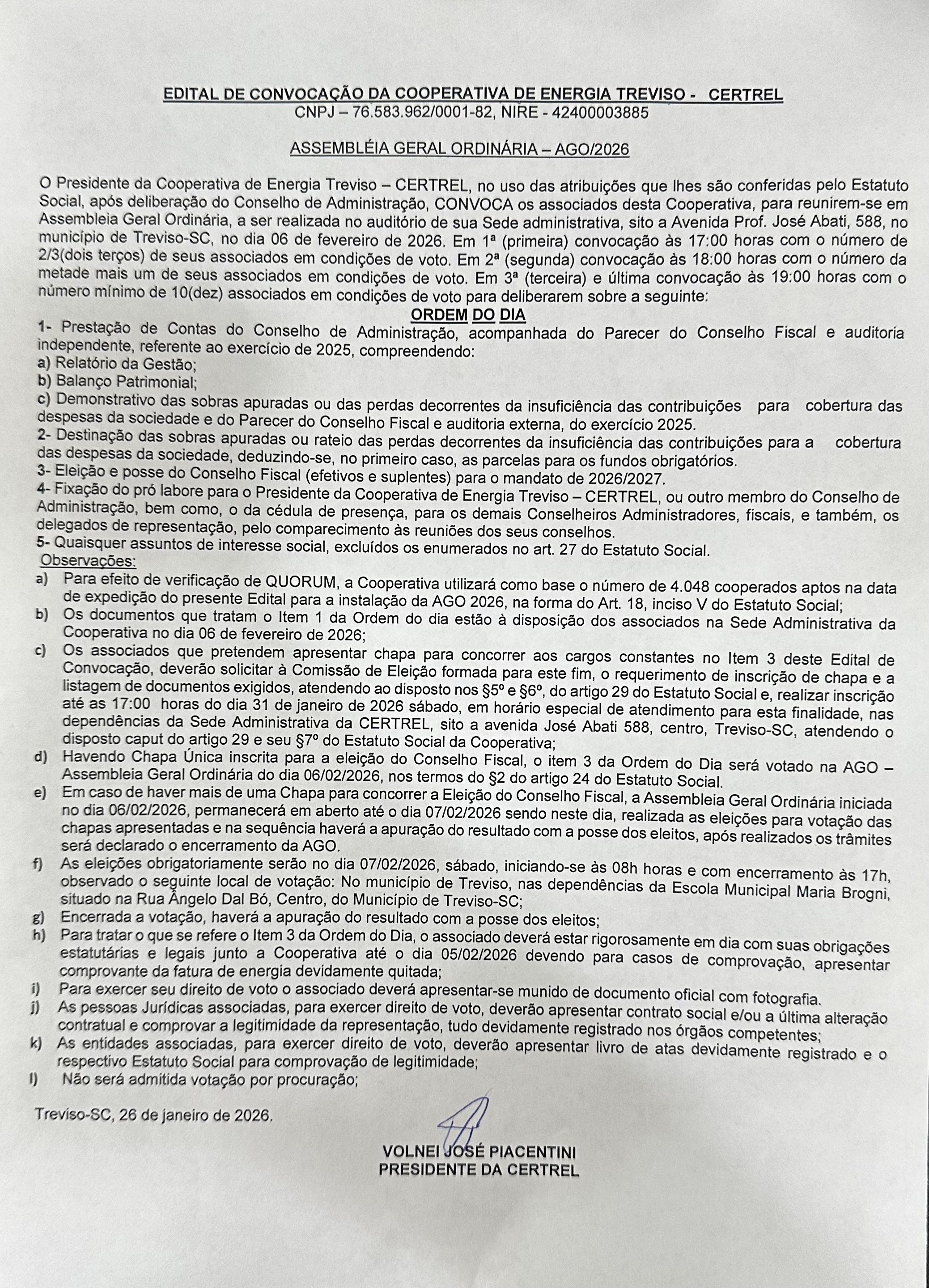A Certrel anuncia a assinatura do Edital de Convocação para a Assembleia Geral Ordinária de 2026, que será realizada no dia 06/02 em primeira convocação as 17H, na Sede Administrativa, em Treviso. Os associados estão convocados para comparecerem à assembleia no dia estipulado, onde acontecerão importantes deliberações sobre a Certrel. Participe das decisões da sua Cooperativa!