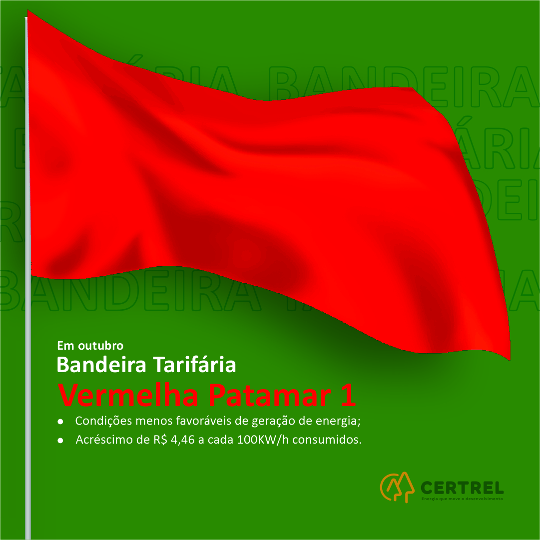 No mês de outubro a bandeira tarifária determinada pela Aneel é vermelha patamar 1. Isso quer dizer que, a cada 100KW/H consumidos os consumidores terão um acréscimo de R$ 4,46 na fatura de energia.