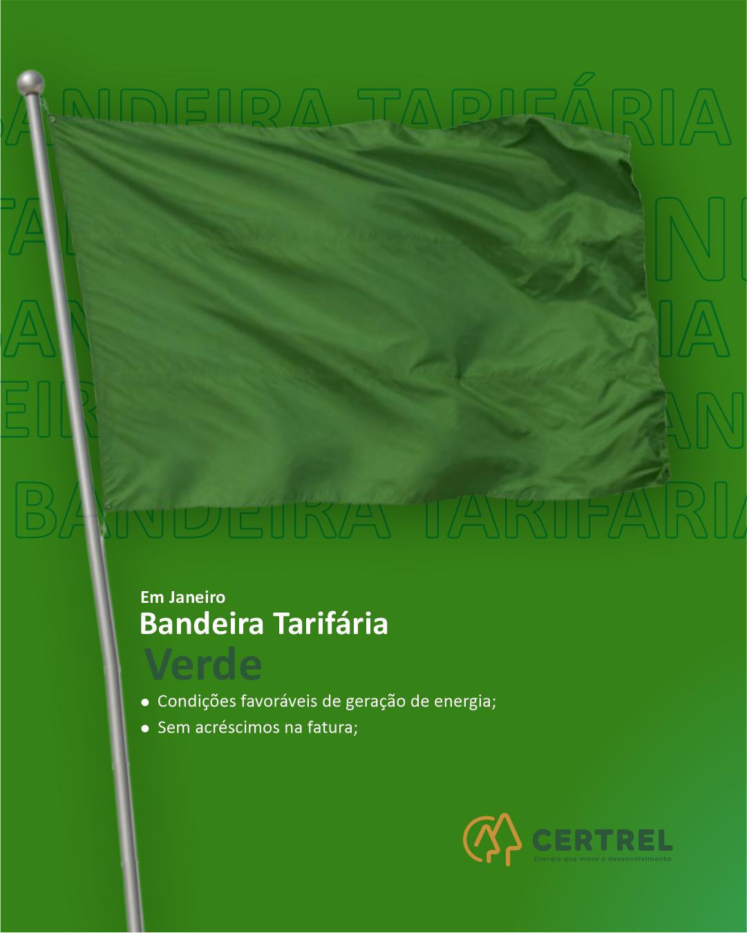 O ano de 2026 iniciou com boas noticias! Em determinação através da Aneel, a bandeira tarifária para o mês de janeiro é verde, sem custos adicionais na sua fatura de energia.