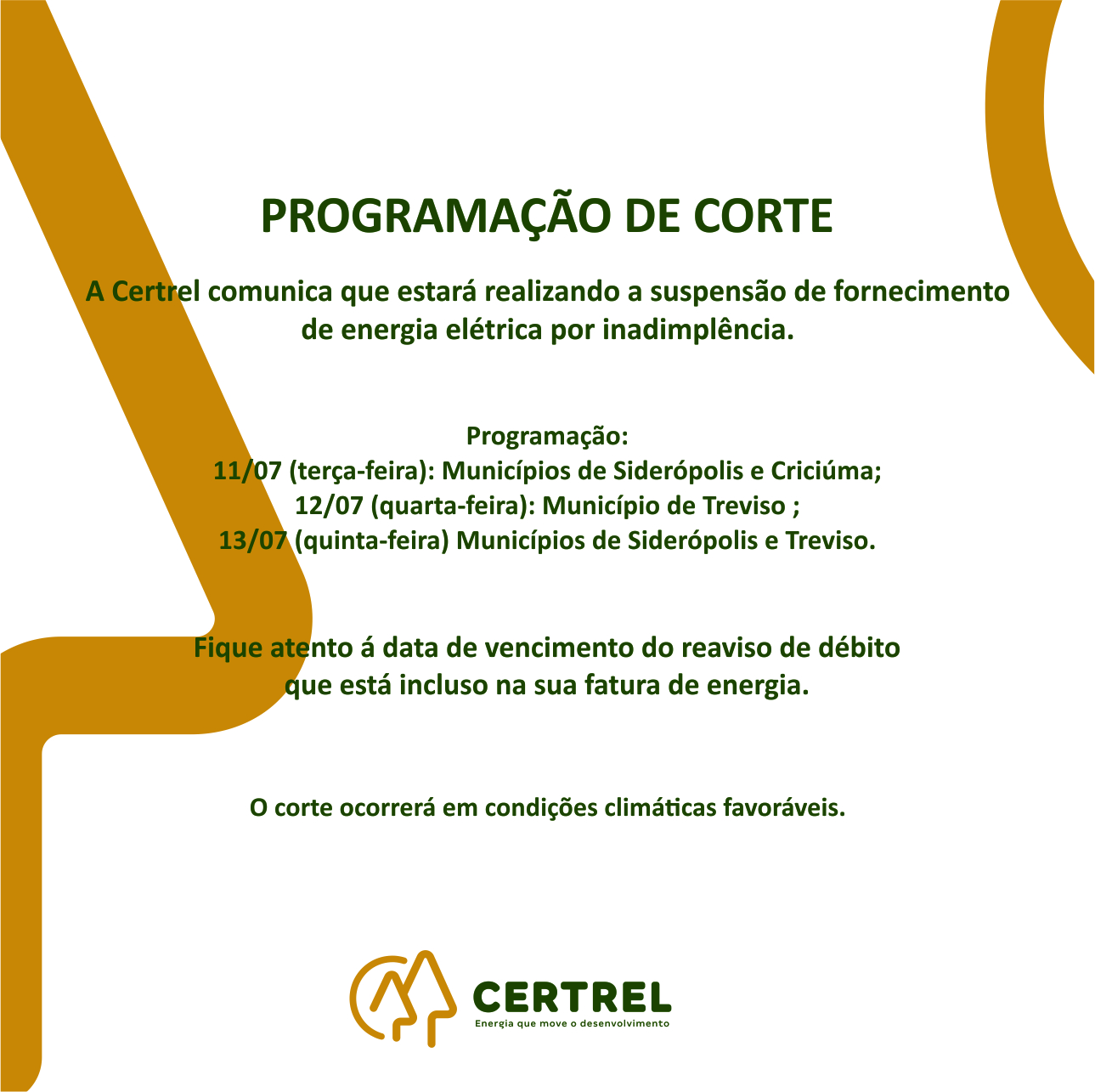 A Certrel comunica que estará realizando a suspensão do fornecimento de energia, confira a programação.